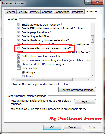 Klik Tools => Internet Option => Advanced => di submenu Browsing hilangkan tanda centang pada: Enable website to use the search pane => Ok, seperti gambar dibawah;